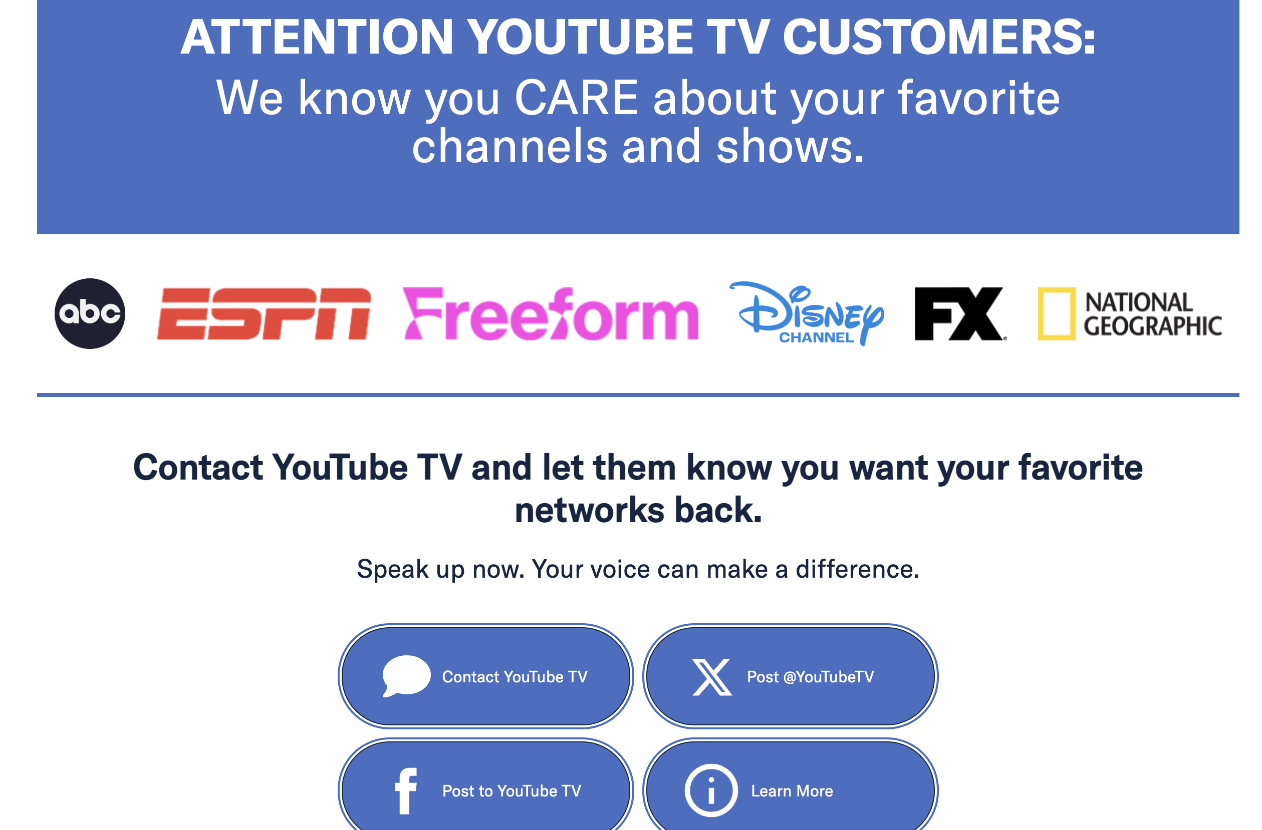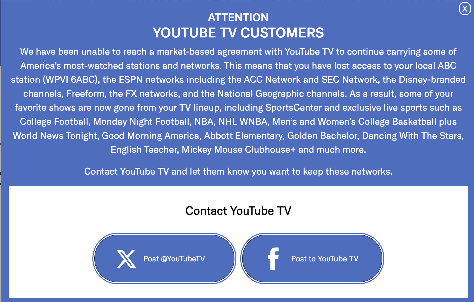 YouTube TV customers: You may lose access to First Take, CFB, NFL and NBA games on ESPN and ABC. Head over to https://t.co/QCeJQoU6kj now so you don’t miss out. pic.twitter.com/77wlwvThL7