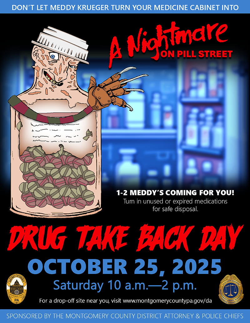 Residents who cannot attend on Oct. 25 can still safely dispose of medications year-round at more than 50 permanent drop-off boxes located throughout Montgomery County, most of which are housed in police departments. These secure boxes are supported by the Pennsylvania District Attorneys Association and Pennsylvania American Water, helping prevent drug misuse and protect the county’s water supply.