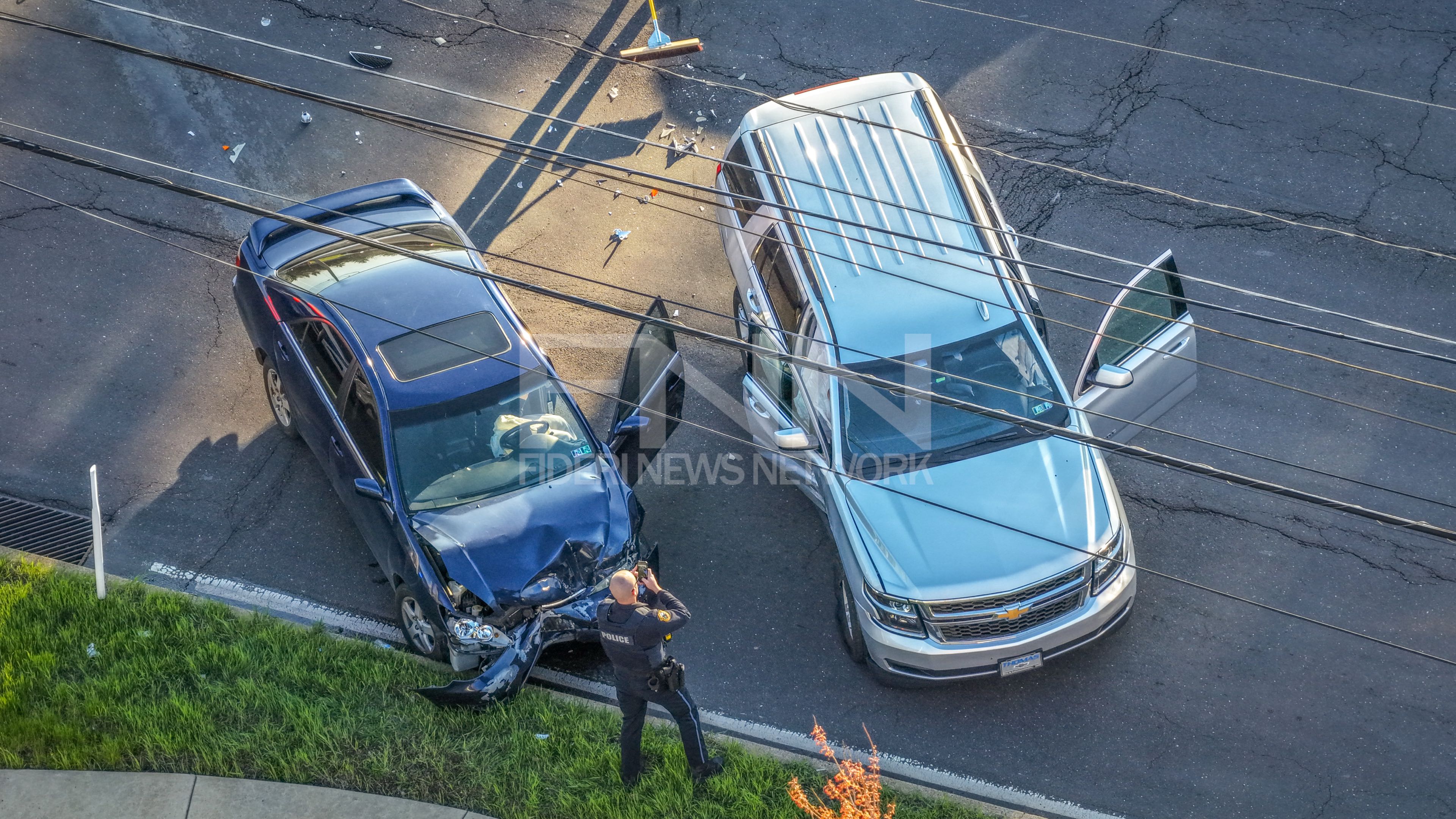 At least one vehicle sustained significant front-end damage. The extent of any injuries remains unclear at this time.