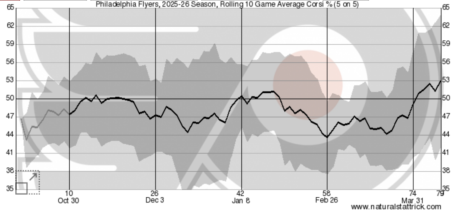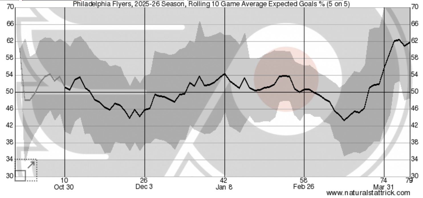 According to NaturalStatTrick, the Flyers possession numbers have climbed significantly over the past month, and in turn, so has their expected goals at 5-on-5.