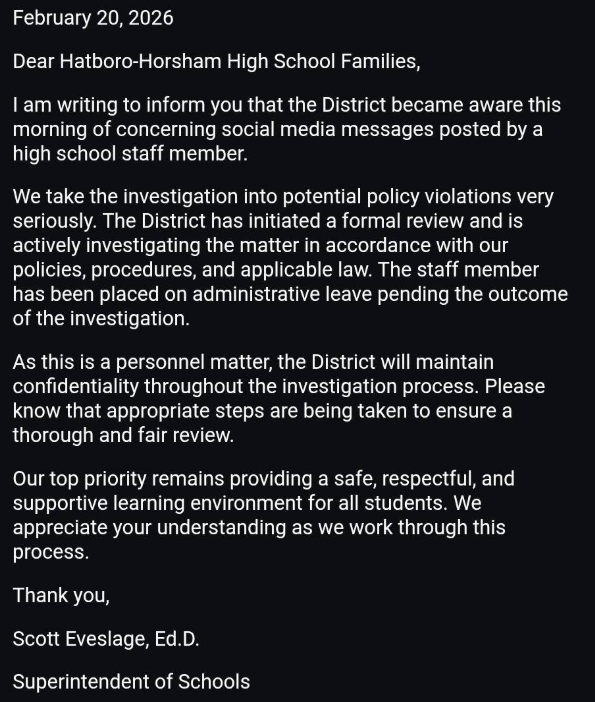 A staff member at Hatboro-Horsham High School has been placed on administrative leave after district officials became aware of what they described as concerning social media activity, according to a message sent to families.