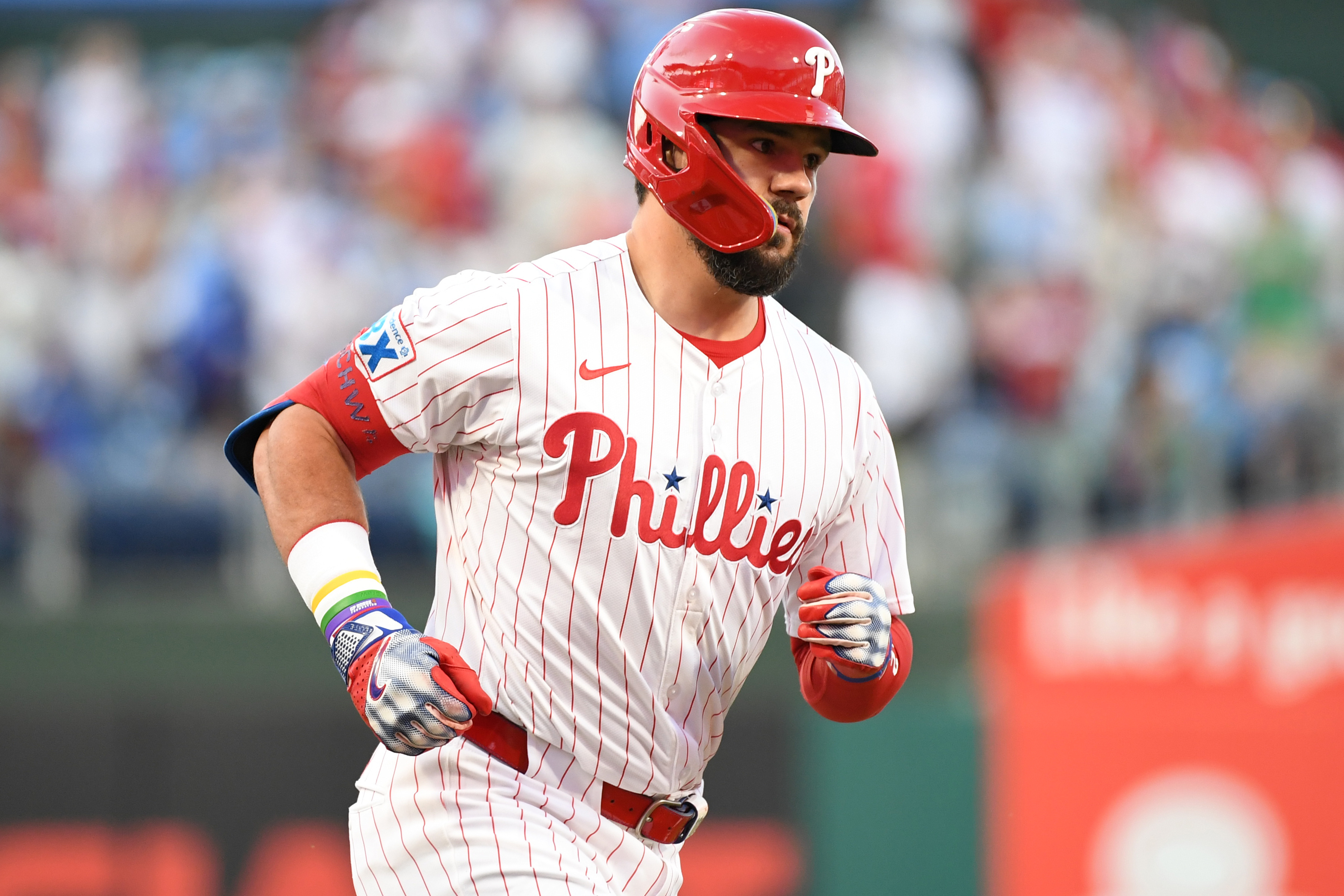 Kyle Schwarber models the Phillies home pinstripes. (Eric Hartline/Imagn Images)